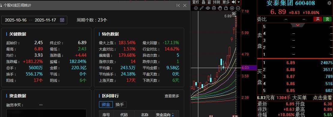 不过安泰集团的过山车走势并未就此结束,随后有资金又将安泰集团股价迅速拉起,随后安泰集团股价震荡回升,最终在收盘前6分钟封住涨停,走出准“天地天”行情。截至收盘,安泰集团报6.89元/股,上涨10.06%,连续第五个交易日涨停。若拉长时间线看,自10月16日起在23个交易日,安泰集团走出23天14板行情,从2.45元/股一路涨至6.89元/股,股价大涨181.2%。